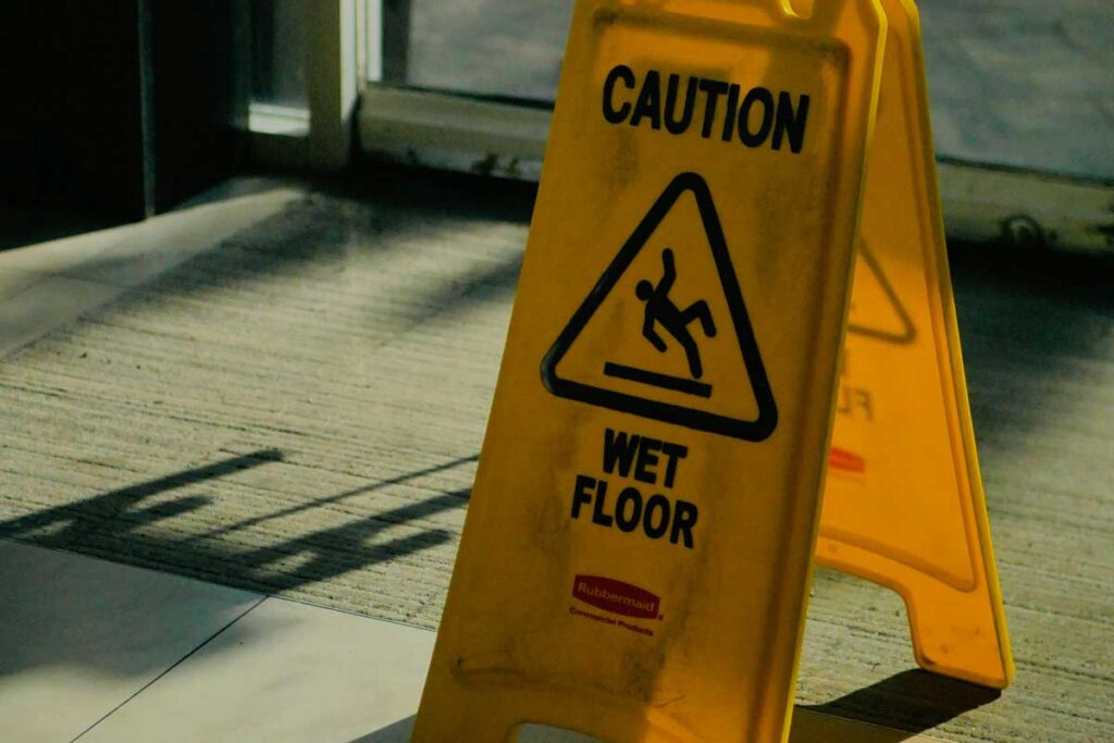 - Wet Floors: Tracked-in rain or snow, or spills in restaurants and grocery stores without proper warning signs.